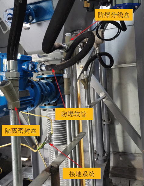 為了消除著火源,團(tuán)隊(duì)對(duì)整個(gè)系統(tǒng)做了接地和電氣防爆等處理。例如,對(duì)MIB主設(shè)備殼體、氣包、卸灰和管鏈系統(tǒng)等進(jìn)行可靠接地;對(duì)不銹鋼風(fēng)管法蘭連接處及除塵軟管增加靜電跨接線。同時(shí),系統(tǒng)不使用任何銅制配件,安裝專用接地網(wǎng)。此外,除塵主控制系統(tǒng)采用正壓防爆柜體,上電前充入隔離氣體,并保證100~200Pa 左右的正壓力;現(xiàn)場(chǎng)布線采用防爆軟管、防爆分線盒和隔離密封盒等措施,特殊地方用密封膠泥封堵等。