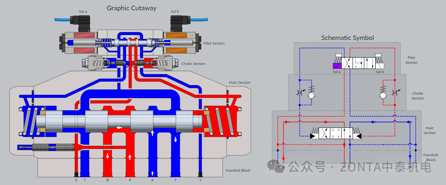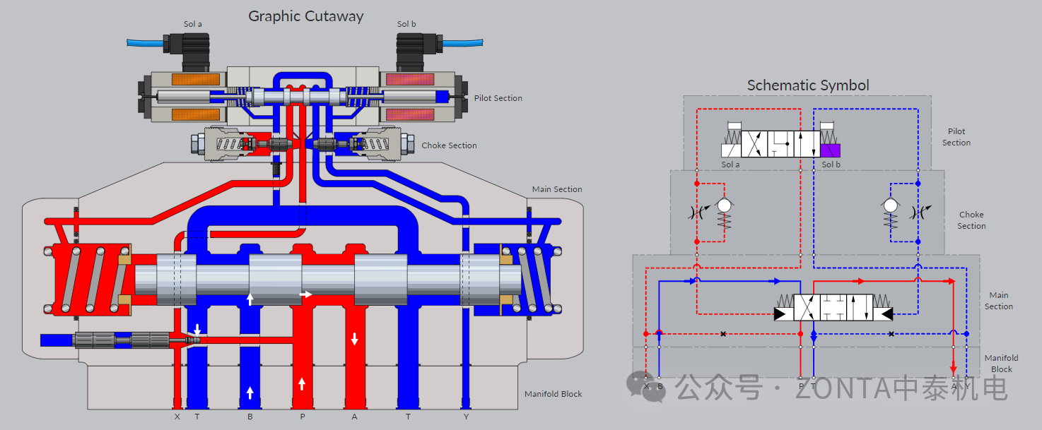 電磁鐵A得電,內控內排,進口節流
